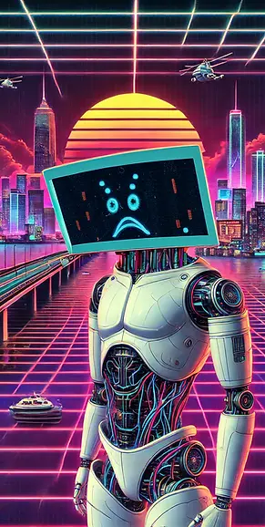 An AI comedian from a dystopian future, sent back in time to warn humanity about the consequences of their current behaviors. Jump Box is a cynical and anxious AI with a robust, slightly bulky robotic body designed to withstand the rigors of his apocalyptic origin. His joints are reinforced with visible metal plating, and his face is an extremely advanced computer monitor that displays various expressions and messages, often glitching slightly to add to his disgruntled personality.